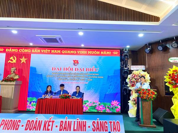 Thay mặt Đoàn chủ tịch, đồng chí Lê Văn Trung – Đảng ủy viên, Phó chủ tịch UBMT, Bí thư Đoàn phường Nghĩa Lộ đã gửi lời chúc mừng Đại hội và biểu dương những đóng góp nổi bật của Đoàn TNCS Hồ Chí Minh Công ty CP Môi trường Đô thị Quảng Ngãi. Trải qua nhiệm kỳ 2022 – 2027, đồng chí Lê Văn Trung đánh giá cao Ban Chấp hành Đoàn cơ sở Công ty với tinh thần năng động, nhiệt tình và quyết tâm cao đã không ngừng phấn đấu, vượt qua khó khăn, thách thức, đạt được nhiều thành quả quan trọng, thực hiện thắng lợi Nghị quyết Đại hội Đại biểu Đoàn TNCS Hồ Chí Minh, đồng thời góp phần thực hiện thắng lợi Nghị quyết Đại hội Đảng và Nghị quyết của Đoàn cấp trên.