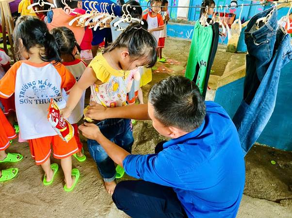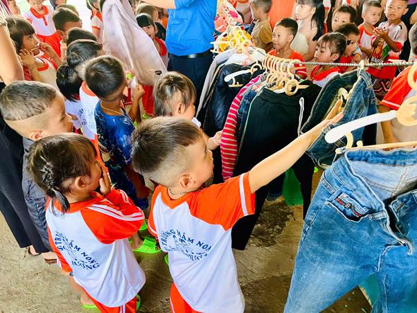 Đây là lần đầu tiên các học sinh trường Mầm non Sơn Thượng tự lựa chọn món quà ý nghĩa của bản thân mình. Ngay tại sân trường, các bạn học sinh có thể lựa chọn những chiếc áo đẹp nhất. Đó là những bộ quần áo còn mới, vừa vặn và còn hương vị ấm áp của tình thương.